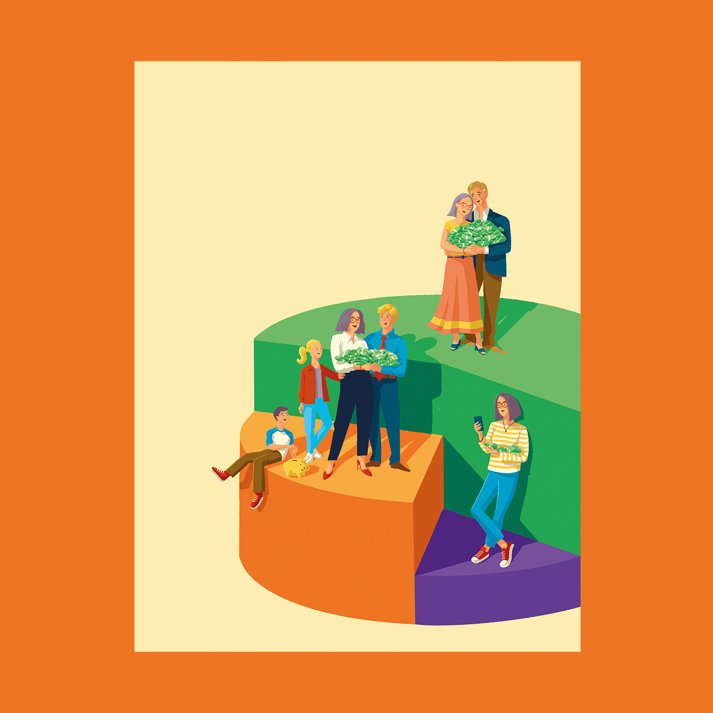 The brief was to focussing on the main article subject of 'Investing at every age' and shows three stages life and the growing investment and returns on those investments.