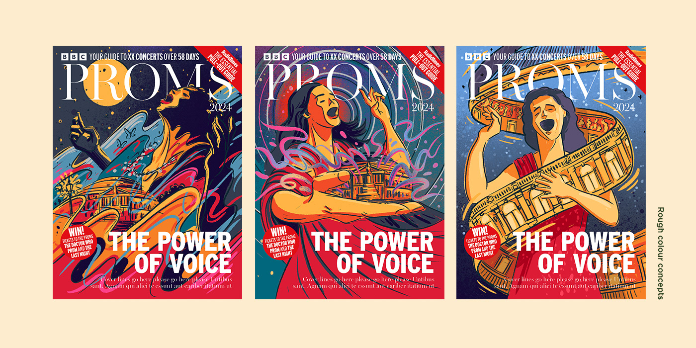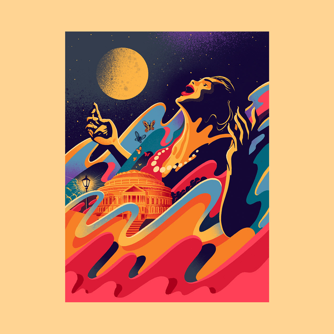 This year’s guide is based on the idea of ‘The Power of the Voice’. The brief was to create an image that featured the exterior of the Royal Albert Hall, with a giant female opera singer in full flow, towering above it and to make it celebratory and jubilant. A real pleasure to create, huge thanks to the team at The Radio Times for this bucket list opportunity.